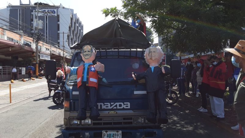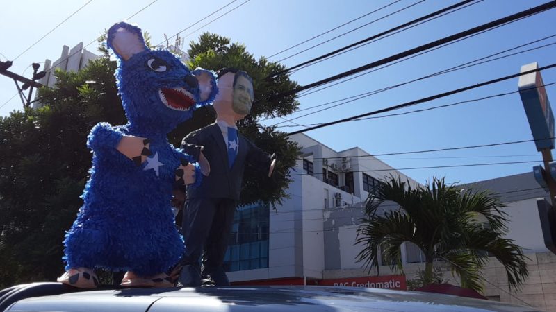 Un monigote de Juan Hernández y una rata representando al Partido Nacional también son parte de la protesta