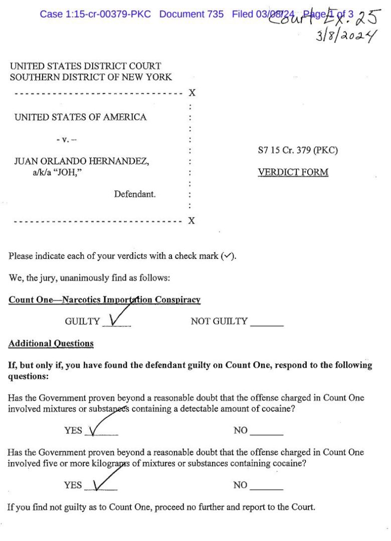 En una sala repleta de silencio, por órdenes del juez Kevin Castel, el jurado, integrado por 12 ciudadanos estadounidenses que conocieron la evidencia presentada entre el 20 de febrero y el 5 de marzo, responsabilizó a Hernández de ser un narcotraficante a gran escala, como evidenció la Fiscalía, que utilizó su poder político para apoyar el tráfico de drogas.