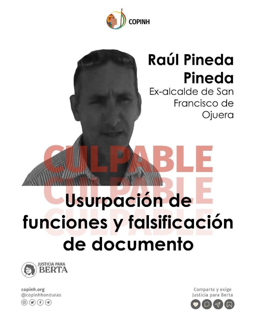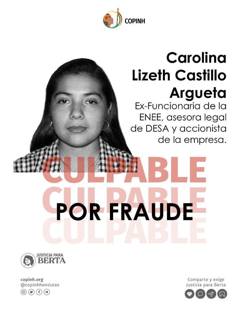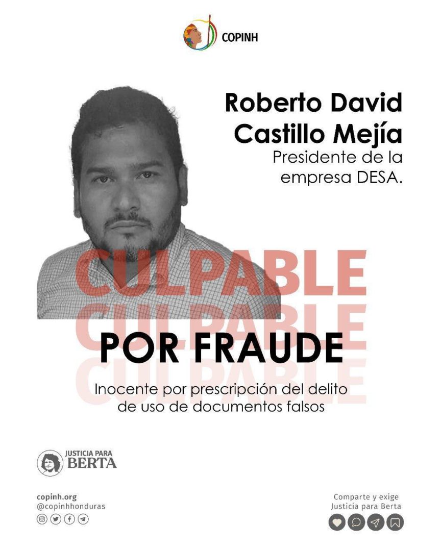 Castillo, condenado como coautor en el asesinato de la ambientalista Lenca, Berta Cáceres, fue encontrado culpable por el delito de fraude. Además, se le responsabilizó penalmente del delito de uso de documentos falsos, pero no fue condenado al haber prescrito.