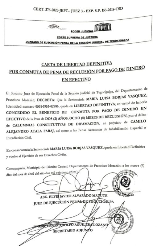 La también diputada por el Partido Libertad y Refundación (Libre) había sido condenada a dos años y ocho meses de reclusión por el delito de calumnias constitutivas de difamación en perjuicio de Camilo Atala.