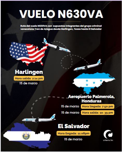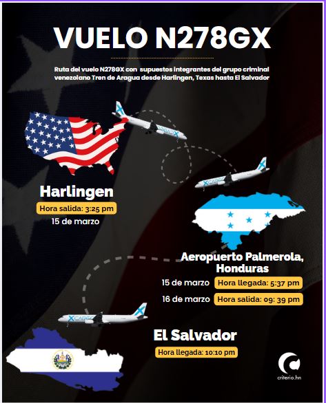 Criterio.hn siguió los vuelos de las aeronaves de la empresa Global X –con las matrículas N630VA, N278GX y N837VA, que salieron del Aeropuerto Internacional Valley, ubicado en Harlingen, Texas, y arribaron a Palmerola la tarde-noche del sábado 15 de marzo–a través de los sitios especializados en rastreo de vuelos FlightAware y Flightradar24.