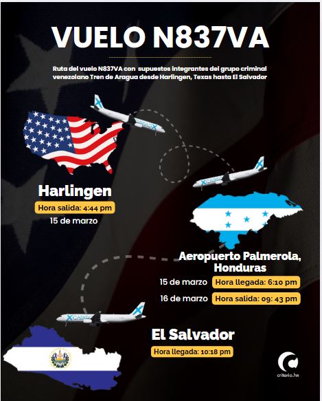 Los vuelos que transportaban migrantes venezolanos, presuntamente asociados al Tren de Aragua, aterrizaron primero en Palmerola, Honduras, antes de dirigirse a El Salvador