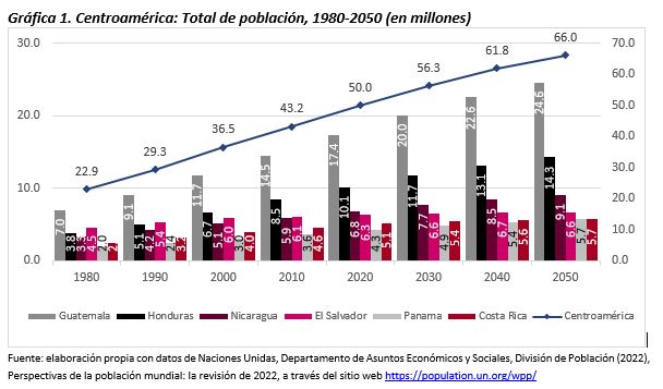 Para el caso de Centroamérica, de acuerdo con estimaciones de la Organización de las Naciones Unidas[1], en 2022 la población alcanzará la cifra de 51.1 millones de personas. Tal como ha sucedido con otras regiones del mundo, Centroamérica ha tenido en las últimas décadas un aumento significativo en la cantidad de su población; entre 1980 y 2020, la población centroamericana pasó de 22.9 millones de personas a 50.0 millones: se duplicó su población. La población seguirá en aumento en las próximas décadas, aunque a un menor ritmo, estimándose que para 2050 alcance un total de 66 millones de personas.