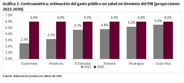 El Instituto Centroamericano de Estudios Fiscales (Icefi) en la Agenda Fiscal Centroamericana 2021-2030 (Vol. 3), tomando como referencia los estándares recomendados por la Organización Panamericana de la Salud (OPS), que sugieren un nivel mínimo de inversión en salud del 6.0% del Producto Interno Bruto (PIB), ha calculado los esfuerzos que deben realizar los Estados centroamericanos para avanzar decididamente en la mejora sustancial de los servicios de salud. De tal cuenta ha estimado que, a 2030, la inversión en ese rubro deberá incrementarse en un 3.5% del PIB en Guatemala, en 2.8% en Honduras, en 1.3% en El Salvador, en 1.2% en Panamá, 0.8% en Nicaragua y 0.5% en Costa Rica. Además, recomienda que este aumento de recursos se acompañe de la adopción de sistemas de atención que se adapten al contexto económico y social de la población que atiende, así como del establecimiento de mecanismos de evaluación permanentes diseñados para asegurar el uso eficiente y eficaz de los recursos.