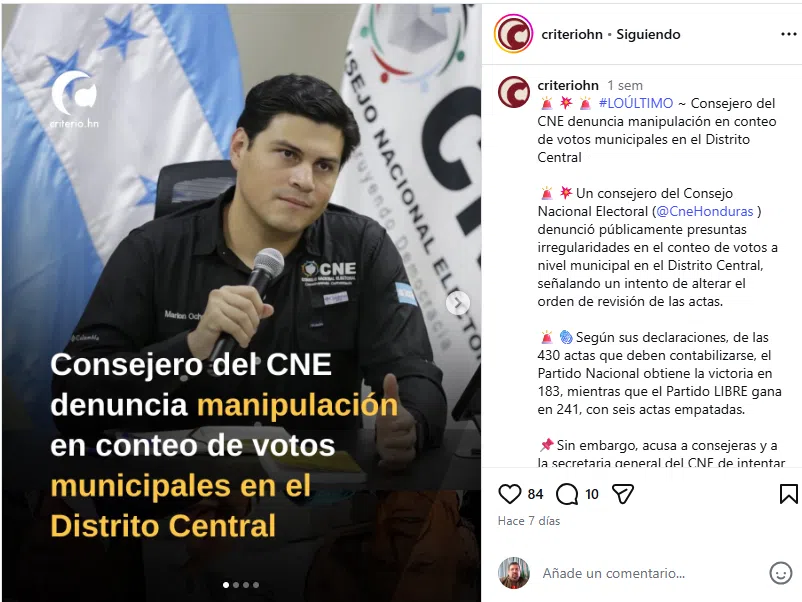 A las acusaciones de estos, se sumaron las del consejero y representante del Partido Libre en el Consejo Nacional Electoral (CNE), Marlon Ochoa, que en reiteradas ocasiones señaló situaciones irregulares y que incluso presentó, un día antes de la fecha límite para la emisión de la declaratoria, una denuncia por manipulación en el conteo de votos y propuso ampliar el plazo para la declaración de los resultados.