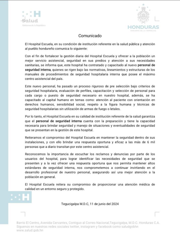«El Hospital Escuela garantiza que el personal de seguridad interna cuenta con la preparación y capacidad necesaria para brindar seguridad en el manejo de situaciones y eventualidades que se presenten en la gestión de este hospital», dice parte del comunicado compartido por el centro hospitalario capitalino.