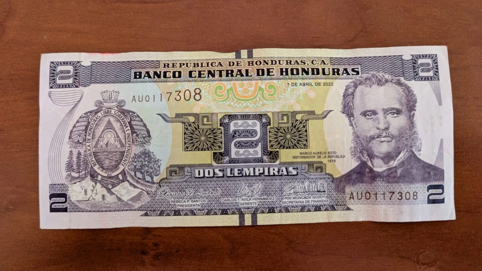 Billete de 2 lempiras el billete de 2 lempiras fue emitido por primera vez el 4 de enero de 1978, con una impresión de 30 millones de piezas encargadas a la casa inglesa Thomas De La Rue. Fue diseñado para conmemorar el centenario del establecimiento del gobierno del Dr. Marco Aurelio Soto, en el anverso aparece el retrato del expresidente Marco Aurelio Soto (quien gobernó entre 1876-1883) y en el reverso una vista panorámica de la Isla del Tigre, en el Golfo de Fonseca.