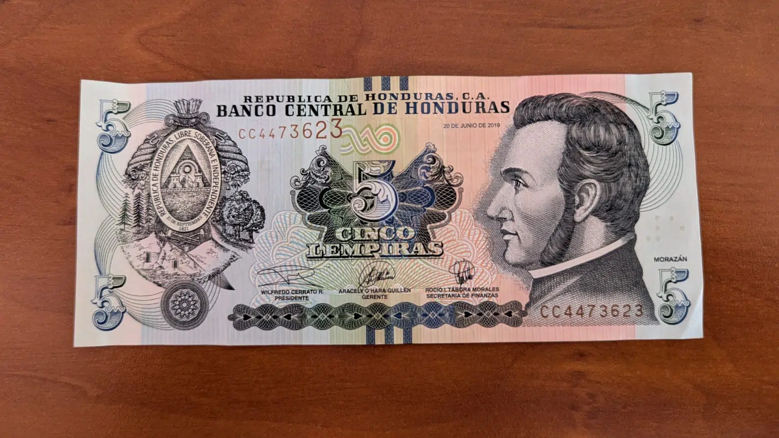 Billete de 5 lempiras este fue el primer billete que emitió el Banco Central de Honduras (BCH) al ponerse en marcha, el 1 de julio de 1950. Se imprimieron 100,000 piezas como parte de su inicio operativo Llevaba en el anverso al General Francisco Morazán, figura muy importante en la historia centroamericana; en el reverso la Batalla de la Trinidad, siendo presidente en ese entonces Juan Manuel Gálvez (1949‑1954).