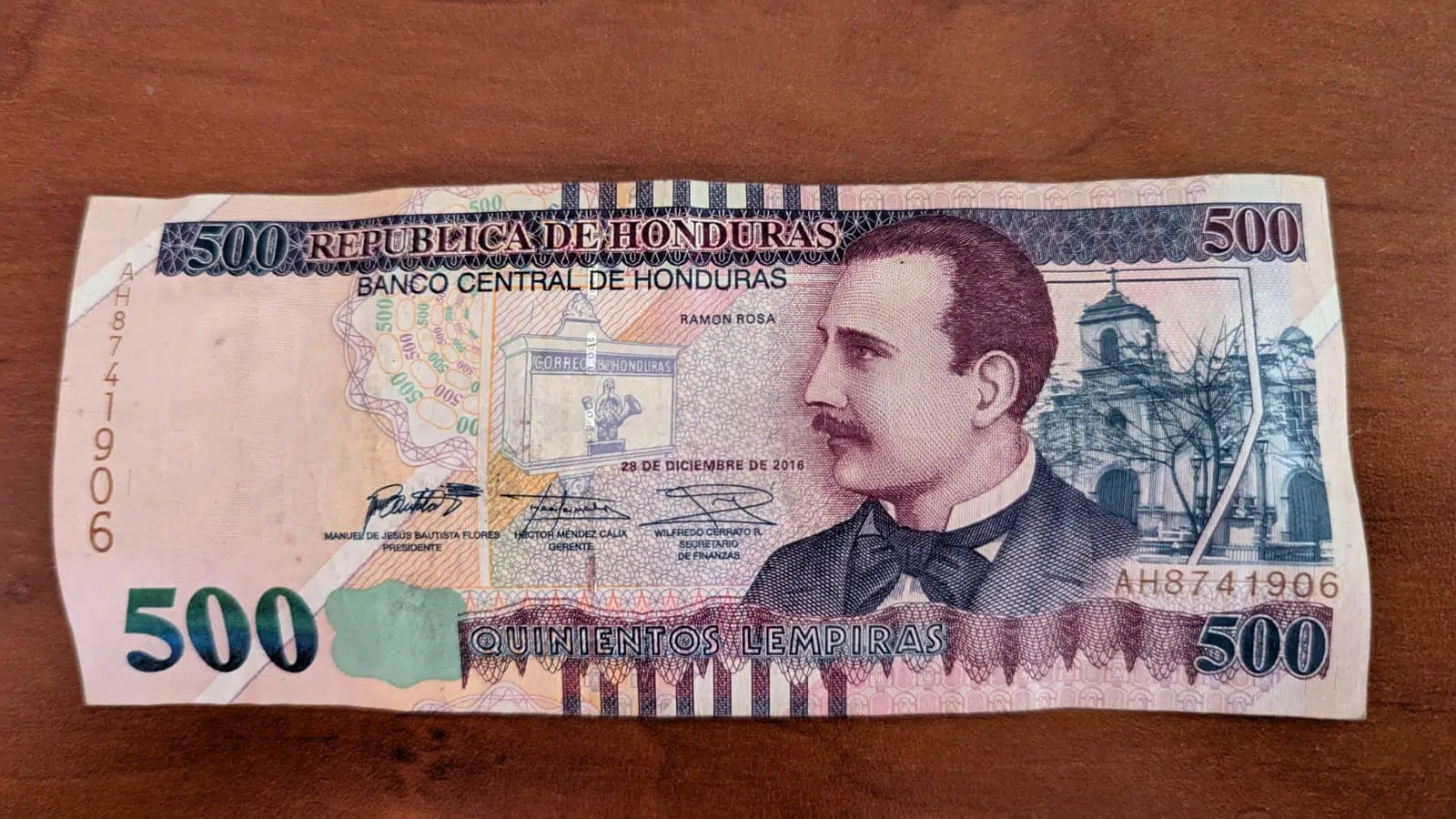 Billete de 500 lempiras se emitió por primera vez el 29 de diciembre de 1997, impreso por Thomas De La Rue, y se presentó al público en 1998. En el frente aparece el retrato del Dr. Ramón Rosa, intelectual y político hondureño, y en el reverso una vista ambientalista de las minas del Rosario de San Juancito. En 1997 el presidente era Carlos Roberto Reina (1994‑1998).