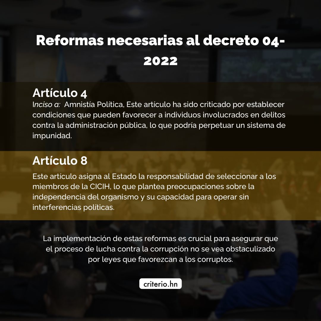 El Decreto 04-2022 ha sido objeto de críticas en Honduras, siendo considerado, por muchos, como un «nuevo pacto de impunidad». Este decreto establece condiciones que limitan la capacidad del sistema judicial para procesar a exfuncionarios acusados de corrupción, lo que ha generado preocupación entre la población y organizaciones de derechos humanos.