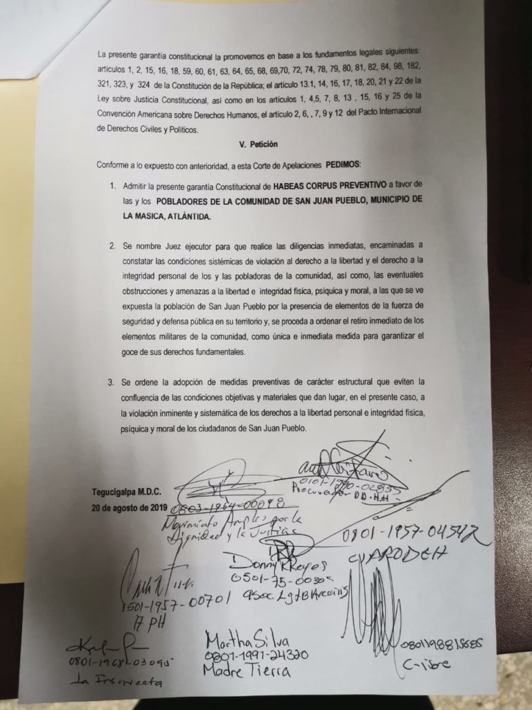 Tegucigalpa.- Al menos 8 organizaciones que trabajan en defensa de los Derechos Humanos en Honduras este día presentaron un recurso de Habeas Corpus Preventivo, (Recurso legal orientado a evitar detenciones arbitrarias y protección a los derechos individuales e integridad física de las personas) y una carta dirigida a las jefaturas de batallones militares, postas policiales y a la Corte Suprema de Justicia (CSJ), a fin de lograr que los efectivos de distintos cuerpos de seguridad del Estado que permanecen instalados en San Juan Pueblo en el departamento de Atlántida sean retirados de la zona.