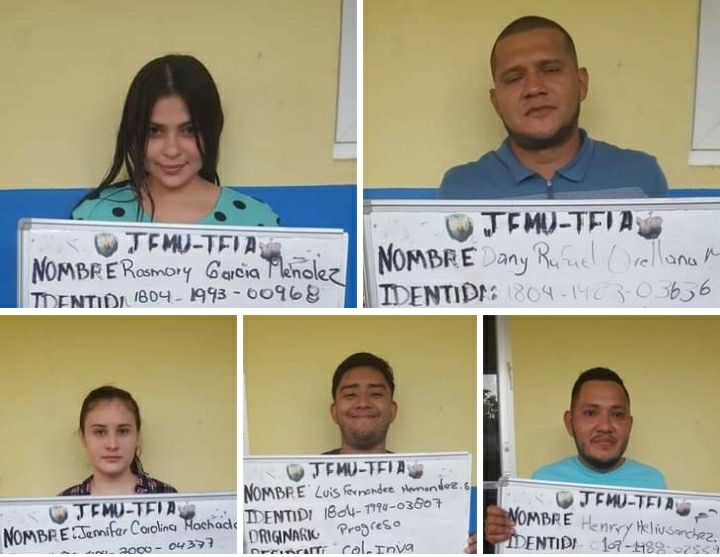 Jennifer Carolina Machado (20), Rosmary Estefani García Méndez (27), Henry Eliú Sánchez Natarén (32), Luis Fernando Hernández Salgado (25) y Dany Rafael Orellana Mendoza (37) fueron detenidos mientras andaban en una camioneta Nissan blanca con rótulos de INVEST-H en Tela, Atlántida, en el norte de Honduras, según la Policía Nacional.