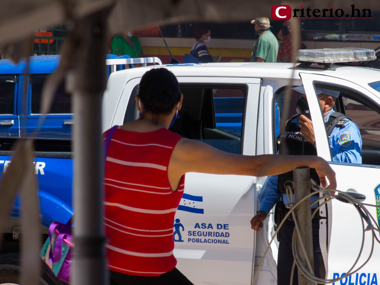 Una patrulla de la Policía Nacional pasa, notan que la gente no guarda la distancia, se bajan los cuatro policías y mientras dos personas colocan un toldo, el altavoz de la patrulla rompe el silencio: “por favor, tomen distancia, un metro, sino el banco tiene la autoridad de cerrar si no cumplen con las medidas”.