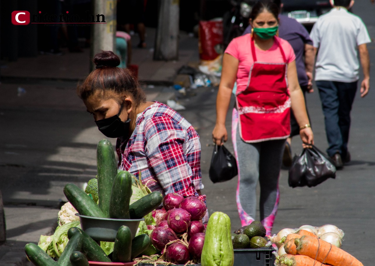 “Si no trabajo no como” repiten los comerciantes informales de la quinta avenida de Comayagüela, los que siguen vendiendo sus productos: frutas, verduras mascarillas lavables. Como Lizeth de 37 años con dos hijos, en su puesto se pueden contar: 1, 2, 3, 10, 20 papayas, unas 10 guayabas, aguacates cubiertos por una sombrilla de varios colores. A unos metros y sin medidas de distancia una fila comienza a hacerse enorme.