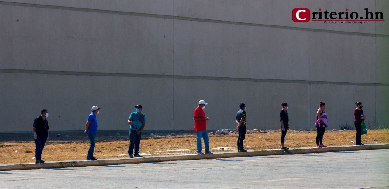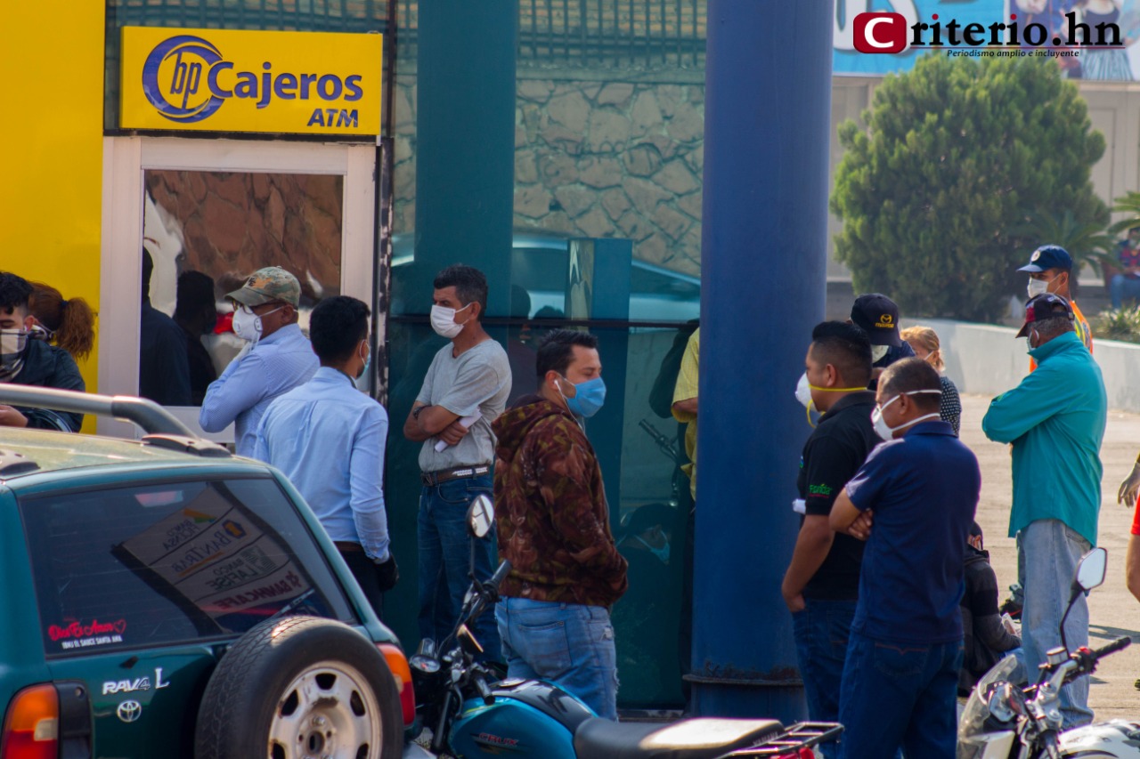 Un nutrido grupo de personas madrugó a hacer fila en esta sucursal de un banco en las cercanías del aeropuerto internacional Toncontín. Día 19 de la cuarentena decretada por el gobierno para frenar el contagio del nuevo Coronavirus. De acuerdo a las nuevas medidas adoptadas por el gobierno, este miércoles pueden atender supermercados, gasolineras y farmacias, pero solo a las personas cuyas cédulas de identidad terminan en 4, 5 o 6.