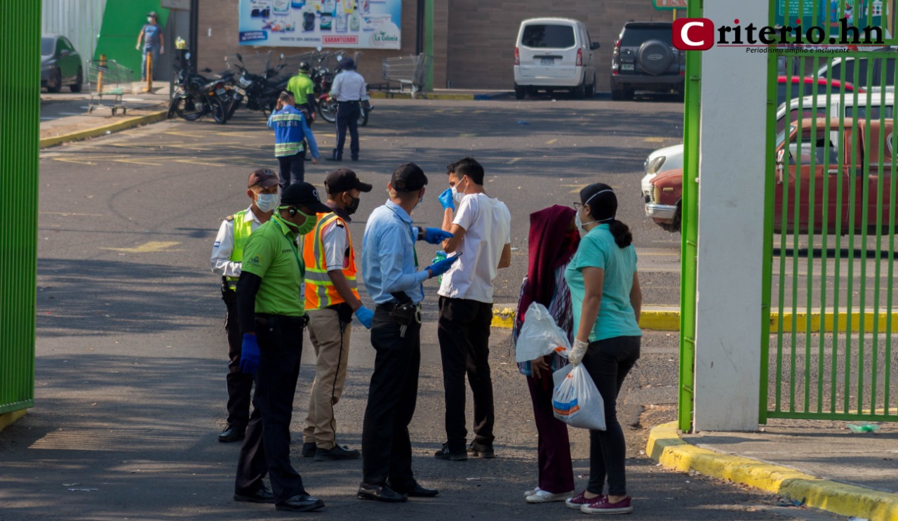 Antes de entrar al estacionamiento de este centro comercial, los clientes pasan por un control de seguridad, luego a hacer fila tomando distancia. Colonia Las Torres.