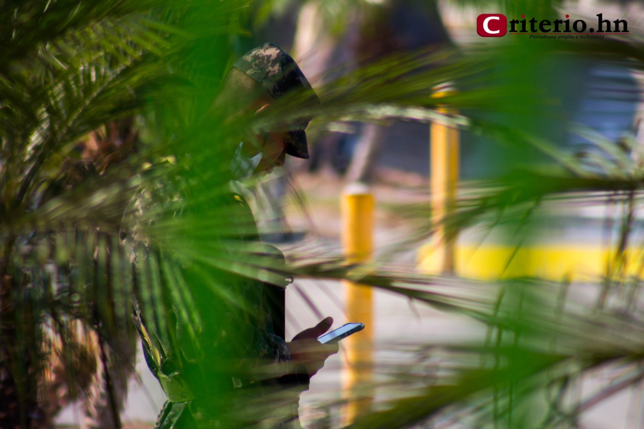 Un militar -dentro del estacionamiento de un supermercado- camuflado por palmeras enanas que se supone debe observar el movimiento de personas que entran y salen, está más atento a su celular.