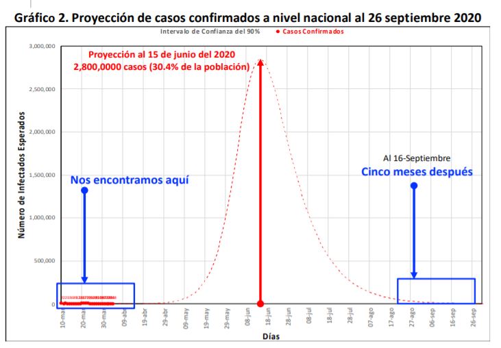 Las proyecciones estiman que en se incrementaría a 16,558 casos a nivel nacional para el 30 de abril del 2020, llegando a un máximo de 2,800,000 personas infectadas al 15 de junio del 2020,