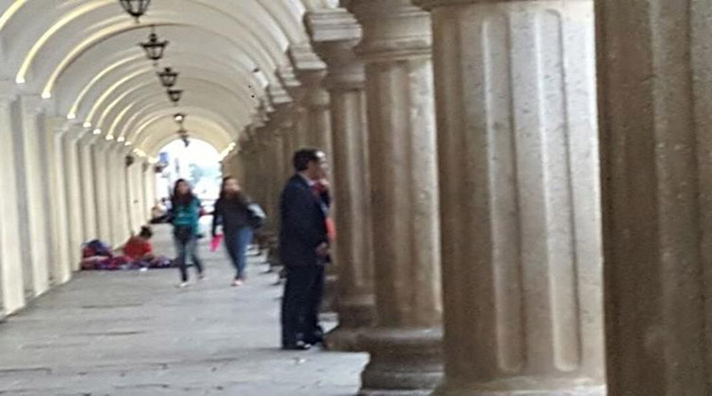 Es una falta de respeto al pueblo guatemalteco,en la toma se ve al sujeto miando como vil animal a una columna del palacio,y 2 jovenas caminando cerca, esos son los representantes del actual gobierno ilegitimo pues tanto el ilegal Juan Robando como la chancha de la canciller.