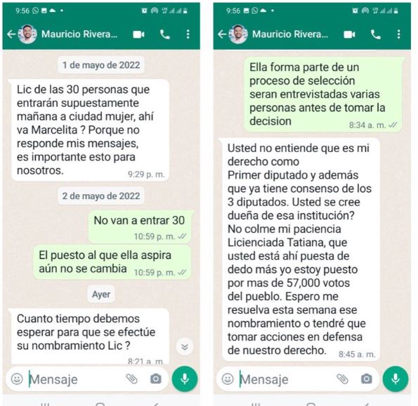 Luego de la denuncia de Tatiana Lara, el congresista Mauricio Rivera, informó a través de sus redes sociales que había sostenido una reunión con el diputado por el departamento de Olancho y secretario del Congreso Nacional, Carlos Zelaya quien, dijo, canalizará sus propuestas para el nombramiento de cargos de sus correligionarios, las que serán revisadas “personalmente” por la presidenta Xiomara Castro.