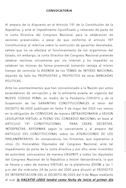 El articulo 191 de la Constitución reza lo siguiente: «Un número de cinco diputados podrá convocar extraordinariamente al Congreso Nacional para sesionar en cualquier lugar de la República, cuando el Ejecutivo, otra autoridad, fuerza mayor o caso fortuito, impidan su instalación o la celebración de sus sesiones».