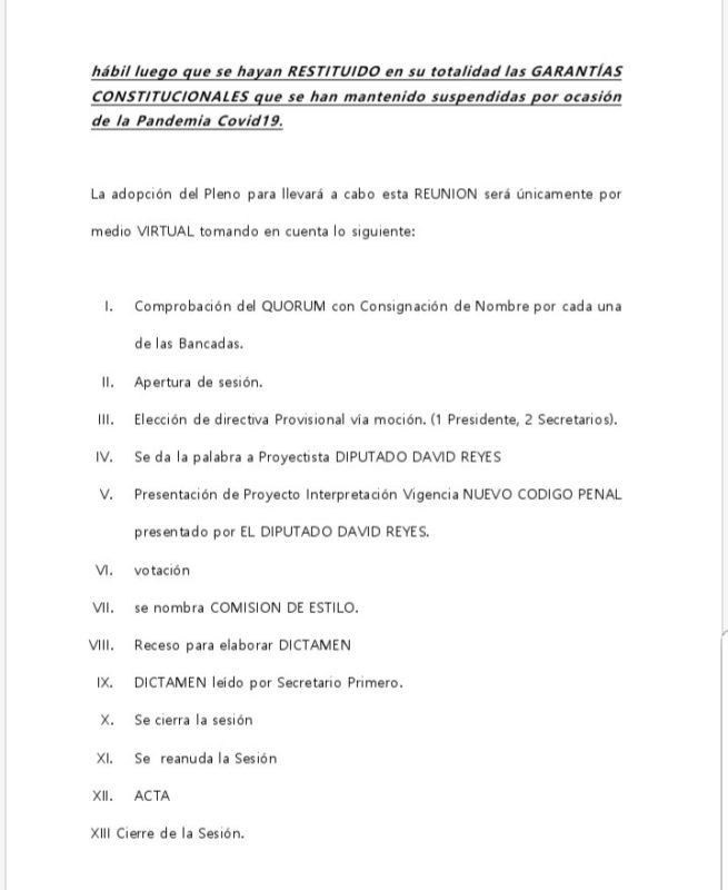 Tegucigalpa.- Diputados de los partidos de oposición: Libertad y Refundación (Libre) innovación y unidad (PINU) y del Partido Liberal de Honduras amparados en el articulo 191 de la Constitución de la Republica convocaron a sesión virtual extraordinaria con la finalidad de detener la entrada en vigencia del nuevo Código penal mañana jueves 25 de junio.