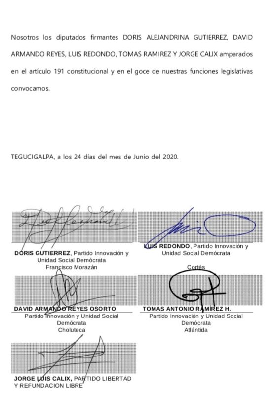 La convocatoria fue realizada por los diputados Luis Redondo, Doris Gutiérrez, Tomás Ramírez y David Reyes del PINU y Jorge Cálix de Libre.