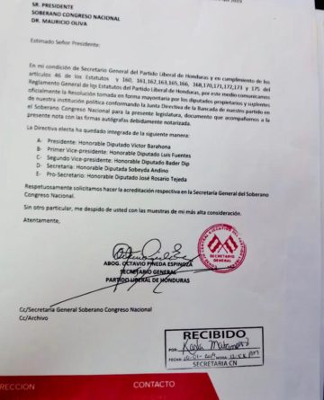 Este mismo día se presento ante la Secretaría del Congreso Nacional la nota formal para el cambio de directiva en la bancada del Partido Liberal como lo muestra la nota respectiva a la que tuvo acceso Criterio.hn