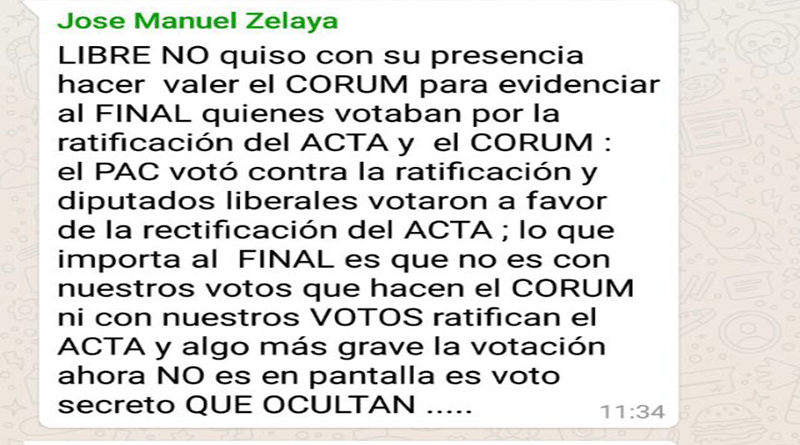 Los diputados de Libre, bajo la conducción del expresidente, Manuel Zelaya Rosales, determinaron no presentarse a la sesión convocada para esta mañana a las 9:00 de la mañana para evitar, según ellos, que el Partido Nacional logrará el quórum e hiciera la ratificación de las reformas que criminalizan la protesta social.