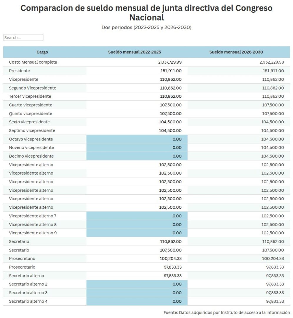 Entre los nuevos cargos, la Junta Directiva incluye vicepresidentes alternos y secretarios alternos, cada uno con salarios que oscilan entre 97,833.33 y 102,500 lempiras mensuales, aumentando así la masa salarial total del Congreso Nacional.