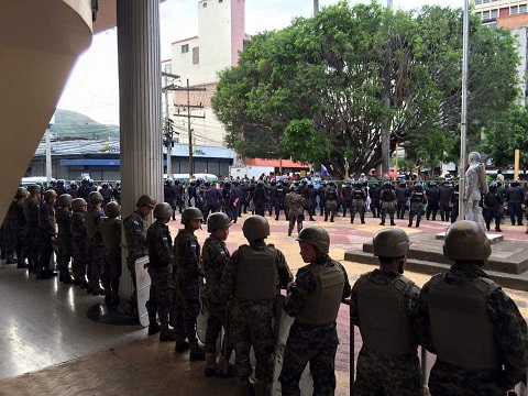 Los bajos del Poder Legislativo lucen abarrotados de policías y militares que están resguardando las instalaciones ante la llegada de la marcha de las antorchas que son pacíficas y que exigen la instalación de la Comisión Internacional Contra la Impunidad en Honduras (CICIH).