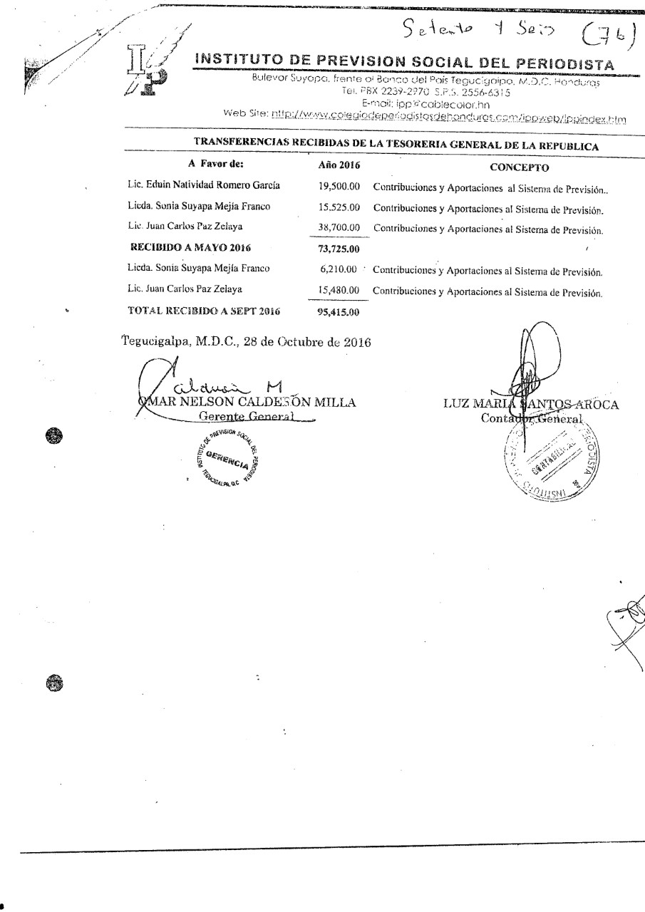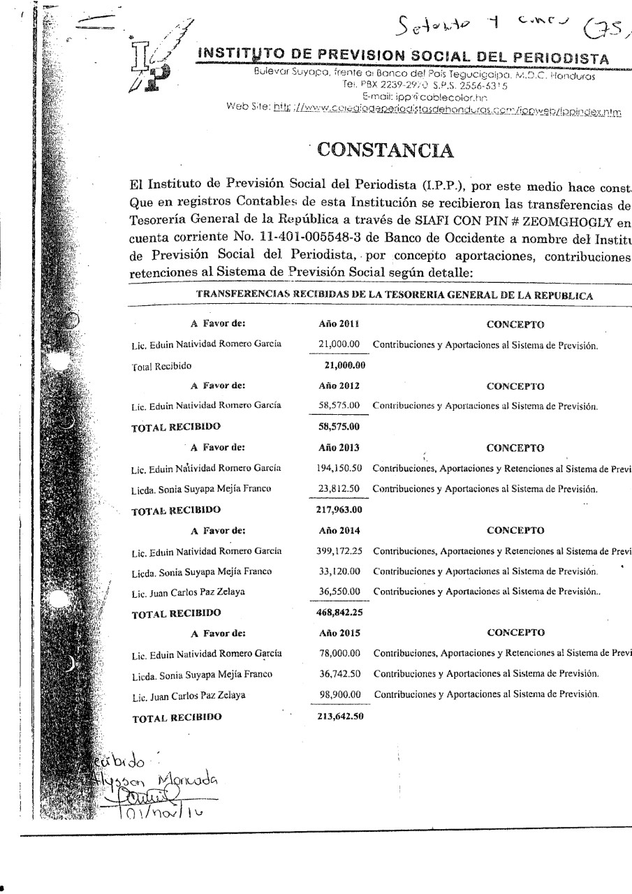 En el documento, el gerente Calderón, hace constar que solo en el año 2014, por el ex presidente del CPH y de la junta directiva del ente de pensiones de los periodistas, Eduin Natividad Romero, el IPP recibió en transferencias del Estado 399,172.25 lempiras por este afiliado, que es funcionario de gobierno, en concepto de “contribuciones, aportaciones y retenciones al sistema de previsión”.