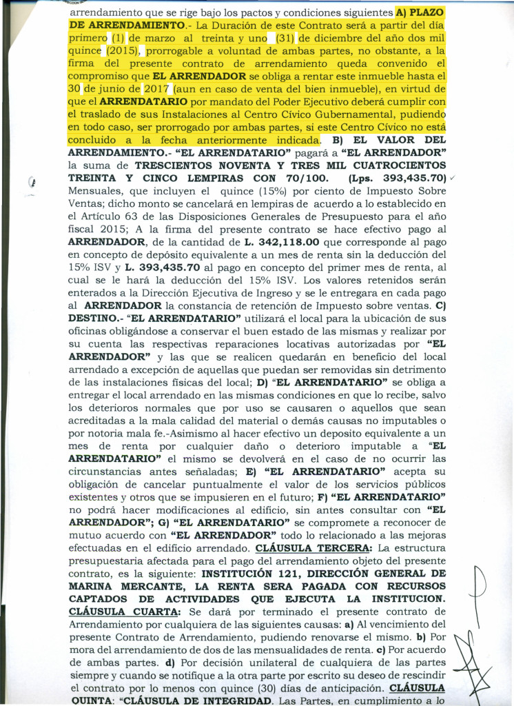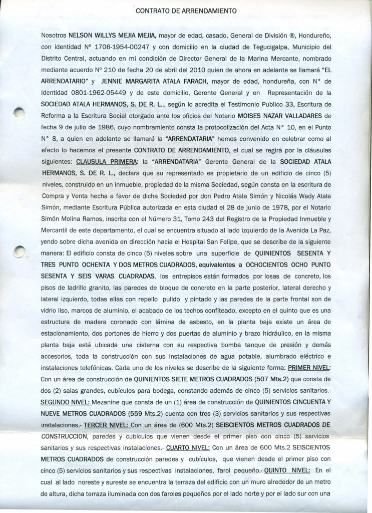 Las irregularidades en la Marina Mercante también involucran el arrendamiento del edificio que ocupan actualmente esas oficinas del Estado en el bulevar Suyapa. Incongruentemente su director pasó a pagar de 8,000 dólares por un edificio de cinco niveles en la Avenida La Paz, a 17,000 dólares por uno de tres niveles y sin condiciones para albergar oficinas de empleados y visitantes.