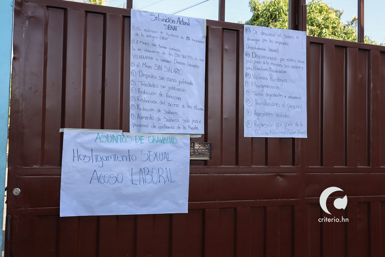Liseth Reyes, empleada de la SENAF expresó que “se trata de una toma por parte de empleados a quienes se nos está vulnerando nuestros derechos”, además, denunció que quienes participaron en la protesta desarrollada el 13 de febrero hasta donde llegó Melvin Ceballos, coordinador de los colectivos de Libre, están siendo víctimas de acoso y traslados sin justificación.