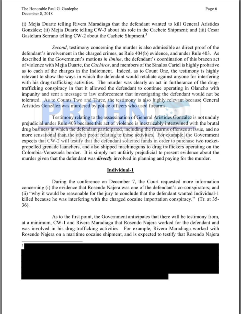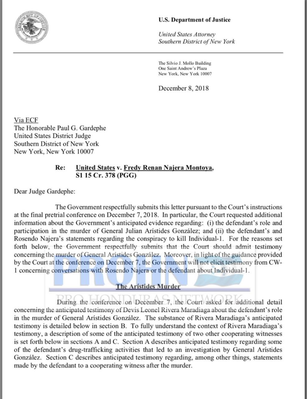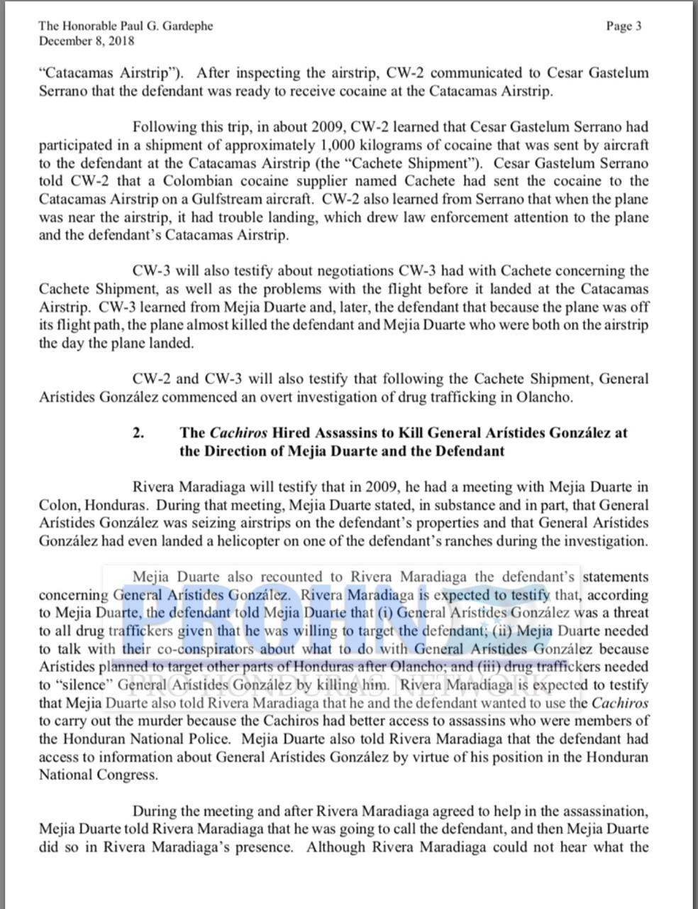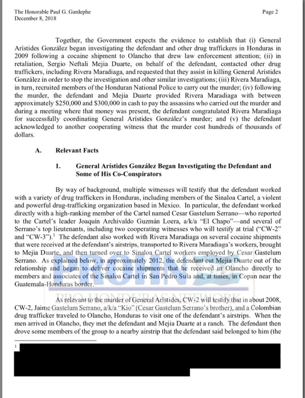 En conjunto, el Gobierno espera que las pruebas establezcan que (i) el general Arístides González comenzó a investigar al acusado y a otros narcotraficantes en Honduras en 2009 tras un envío de cocaína a Olancho que atrajo la atención policial; (II) en represalia, Sergio Neftali Mejia Duarte, en nombre del acusado, contactó a otros narcotraficantes, incluyendo a Rivera Maradiaga, y solicitó que asistieran a matar al general Arístides González con el fin de detener la investigación y otros similares investigaciones (III) Rivera Maradiaga, a su vez, reclutó a miembros de la policía nacional hondureña para llevar a cabo el asesinato; (IV) tras el asesinato, el acusado y Mejía Duarte proporcionaron a Rivera Maradiaga entre aproximadamente $250.000 y $300.000 en efectivo para pagar a los asesinos que llevaron a cabo el asesinato y durante una reunión donde estaba presente el dinero, el acusado felicitó a Rivera Maradiaga por coordinar con éxito el asesinato del general Arístides González; y (v) el acusado reconoció a otro testigo cooperante que el asesinato costó cientos de miles de dólares.