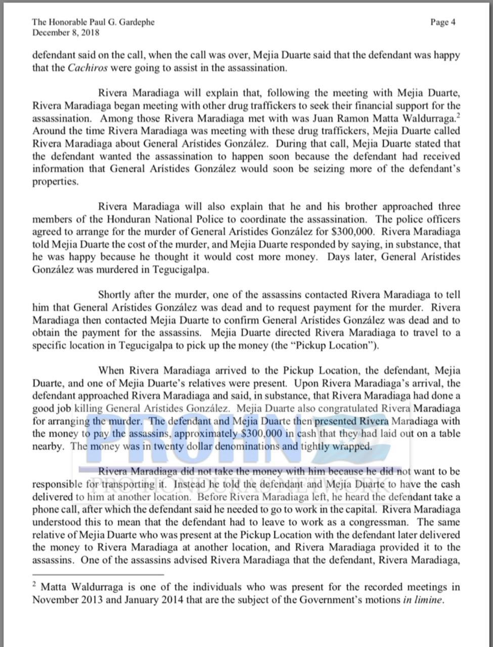 Aunque Rivera Maradiaga no podía escuchar lo que el acusado dijo en la llamada, cuando la llamada había terminado, Mejía Duarte dijo que el acusado estaba contento de que los Cachiros iban a ayudar en el asesinato. Rivera Maradiaga explicará que, tras la reunión con Mejía Duarte, Rivera Maradiaga comenzó a reunirse con otros narcotraficantes para buscar su apoyo financiero para el asesinato. Entre los que se reunió Rivera Maradiaga estaba Juan Ramón Matta Waldurraga. 2 en la época en que Rivera Maradiaga se reunía con estos narcotraficantes, Mejía Duarte llamó a Rivera Maradiaga sobre el general Arístides González. Durante esa convocatoria, Mejía Duarte afirmó que el acusado deseaba que el asesinato pasaría pronto porque el acusado había recibido información de que el general Arístides González pronto estaría aprovechando más de las propiedades del acusado.
