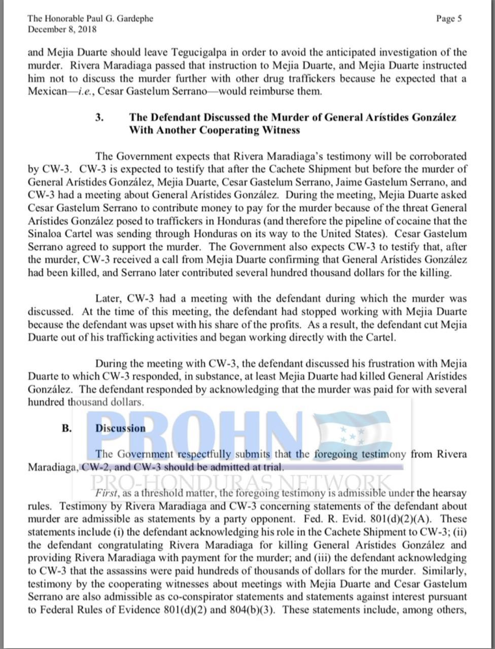 El Gobierno espera que el testimonio de Rivera Maradiaga sea corroborado por CW-3. Se espera que CW-3 testifique que después del cargamento de cachete, pero antes del asesinato del general Arístides González, Mejía Duarte, Cesar Gastelum Serrano, Jaime Gastelum Serrano y CW-3 tuvieron una reunión sobre el general Arístides González. Durante la reunión, Mejía Duarte le pidió a César Gastelum Serrano que contribuyera con dinero para pagar el asesinato debido a la amenaza que el general Arístides González planteó a los traficantes en Honduras (y por lo tanto el oleoducto de cocaína que el cártel de Sinaloa estaba enviando a través de Honduras en su camino a los Estados Unidos). César Gastelum Serrano aceptó apoyar el asesinato. El gobierno también espera que CW-3 testifique que, después del asesinato, CW-3 recibió una llamada de Mejía Duarte confirmando que el general Arístides González había sido asesinado, y Serrano más tarde contribuyó con varios cientos de miles de dólares por el asesinato. Más tarde, CW-3 tuvo una reunión con el acusado durante el cual se discutió el asesinato. En el momento de esta reunión, el acusado había dejado de trabajar con Mejía Duarte porque el acusado estaba molesto con su parte de los beneficios. Como resultado, el acusado cortó a Mejía Duarte de sus actividades de tráfico y comenzó a trabajar directamente con el cartel.