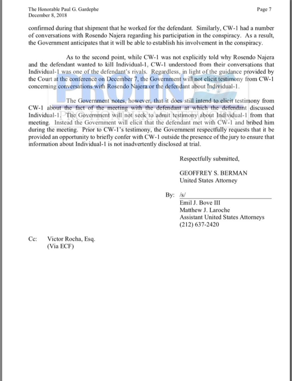 En cuanto al segundo punto, mientras que CW-1 no se le dijo explícitamente por qué Rosendo Nájera y el acusado querían matar a individuo-1, CW-1 entendió de sus conversaciones que individual-1 era uno de los rivales del acusado. No importa, a la luz de las orientaciones proporcionadas por el Tribunal en la Conferencia del 7 de diciembre, el gobierno no obtendrá el testimonio de CW-1 en relación con las conversaciones con Rosendo Nájera o el acusado sobre el individuo-1.