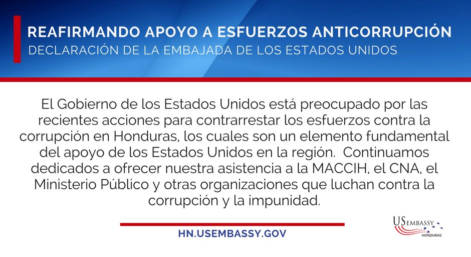 Tegucigalpa.- La embajada de los Estados Unidos emitió esta tarde un pronunciamiento mediante el cual expresa su preocupación por las recientes acciones para contrarrestar los esfuerzos contra la corrupción en Honduras.