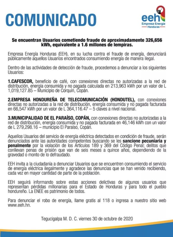 La EEH mencionó tres instituciones que están con conexiones ilegales, entre estas Cafescor que le ha ocasionado un perjuicio económico de L. 1,019,127.85, Hondutel con L. 364,116.47 y la municipalidad de El Paraíso, Copán, zona occidente de Honduras con L. 279,298.16.