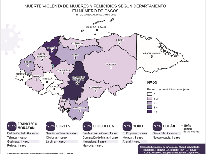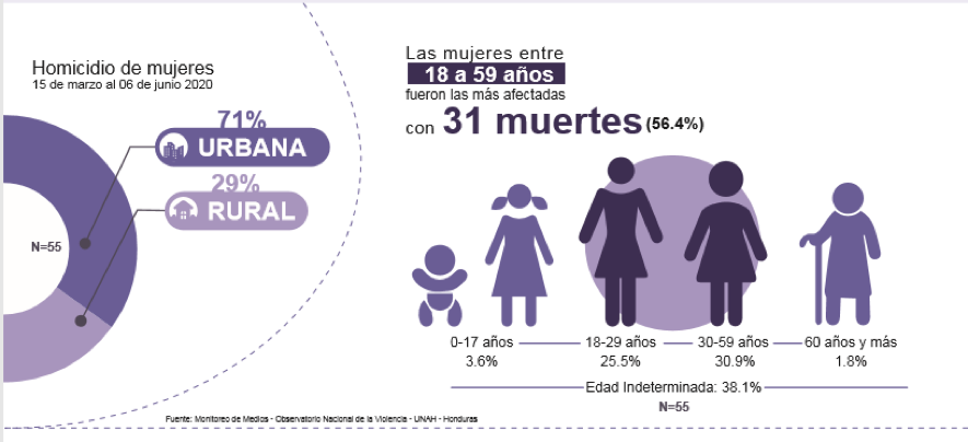 La peor parte de la pandemia del coronavirus se la ha llevado la mujer, según cifras del Observatorio de la Violencia. La mayor parte de los feminicidios en 2020 en Honduras han ocurrido en la zona urbana, con 71%, y en la rural, con 29%.