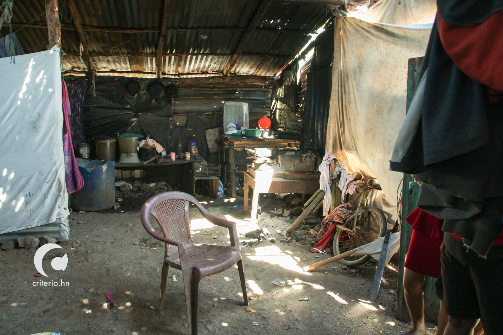 Antonia, refiere que ya lleva mas de cinco años como desplazada, pero además en situación de pobreza extrema. En la pequeña casa de no más de dos metros cuadrados, vive con otra de sus hijas y sus dos nietos. “Hay días que solo hay comida para los niños”, comenta, al tiempo que explica a Criterio.hn que su hija sale a trabajar y regularmente gana entre 100 a 150 lempiras diarios.