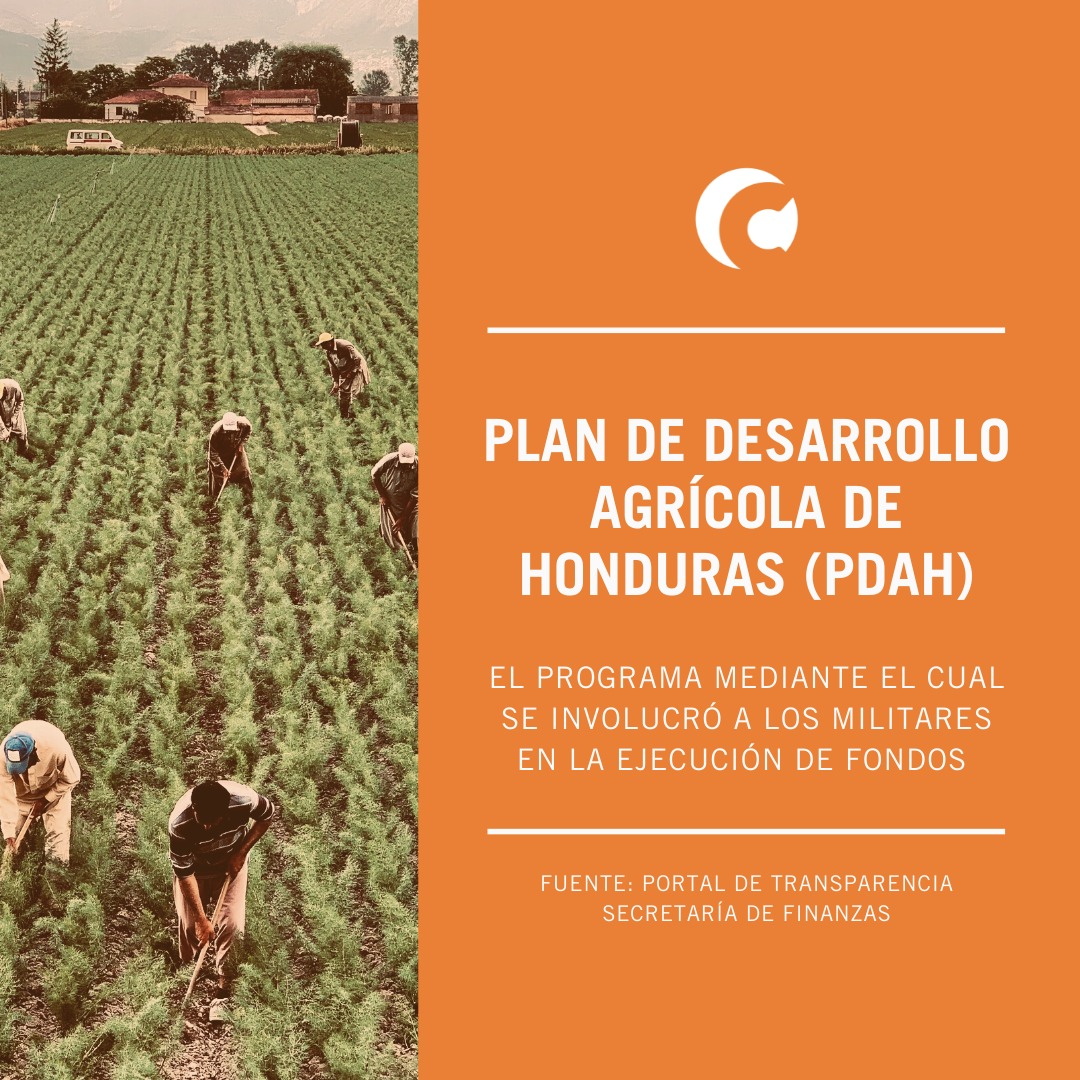 Mediante el Decreto Ejecutivo 052-2019, Hernández creó el Plan de Desarrollo Agrícola de Honduras (PDAH) que no fue más que la militarización del sector agrícola al conferir a los uniformados la administración de millonarios fondos destinados a desarrollar el agro y garantizar la seguridad alimentaria.