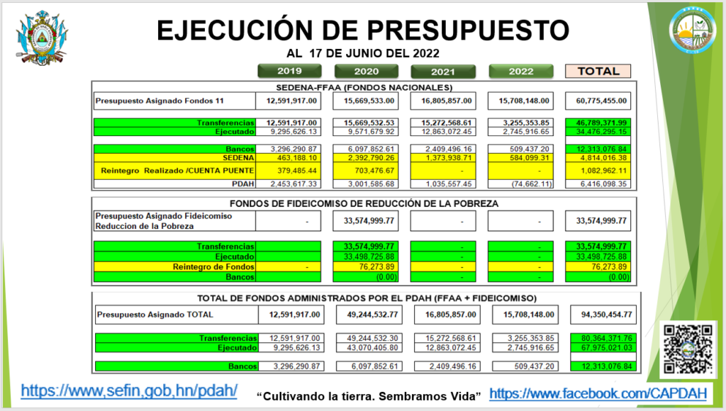 El portal de la Secretaría de Finanzas, desde el 18 de octubre de 2019, que entró en vigencia el programa adscrito a las Fuerzas Armadas, hasta junio de 2022, exhibe que se asignaron 194 millones 350 mil 454.77 de los cuales se trasfirieron 80 millones 364 mil 371.76 y se ejecutaron 67 millones 975 mil 021.03, quedando en la cuenta de bancos 12 millones 313 mil 076.84.