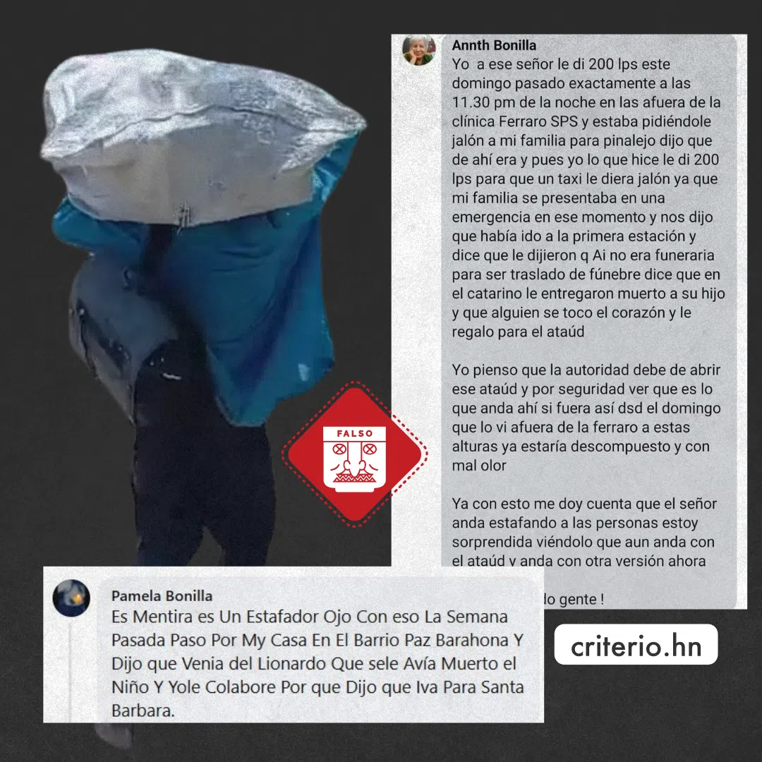 Otra cibernauta que se identifica como Pamela Bonilla, en otra publicación que se viralizó, comentó: “es mentira, es un estafador. Ojo con eso”. Según el testimonio de la mujer, el hombre que carga en su espalda el pequeño ataúd, pasó por su casa y dijo que su hijo había muerto en el Hospital Leonardo Martínez y que era de Santa Bárbara.