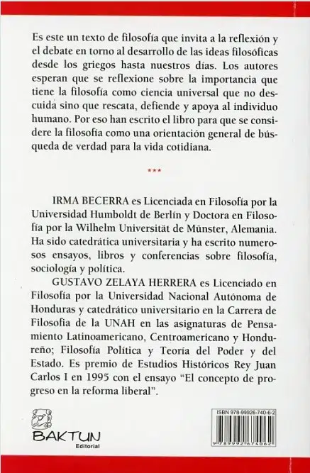 El libro, “Pensando Filosofía”, escrito en coautoría con el filósofo hondureño, Gustavo Zelaya Herrera, está organizado en cinco capítulos que tratan diversos temas de la filosofía en correlación con la importancia que tiene el saber filosófico para orientar a las personas en su proyección en el mundo. El libro posee 351 páginas, así como ilustraciones de filósofos importantes en la historia de la filosofía y un índice de nombres que figuran en el mismo. En esta oportunidad sólo nos referiremos a un capítulo del libro y dejaremos, por falta de espacio, la parte histórica, la parte de teoría del conocimiento, la parte ontológica y la parte de axiología tratadas en los cuatro capítulos restantes del libro. El texto posee, además, una guía de evaluación y control de lectura al final de cada capítulo, así como conclusiones que pueden ser discutidas con los estudiantes para aclarar dudas y responder interrogantes.