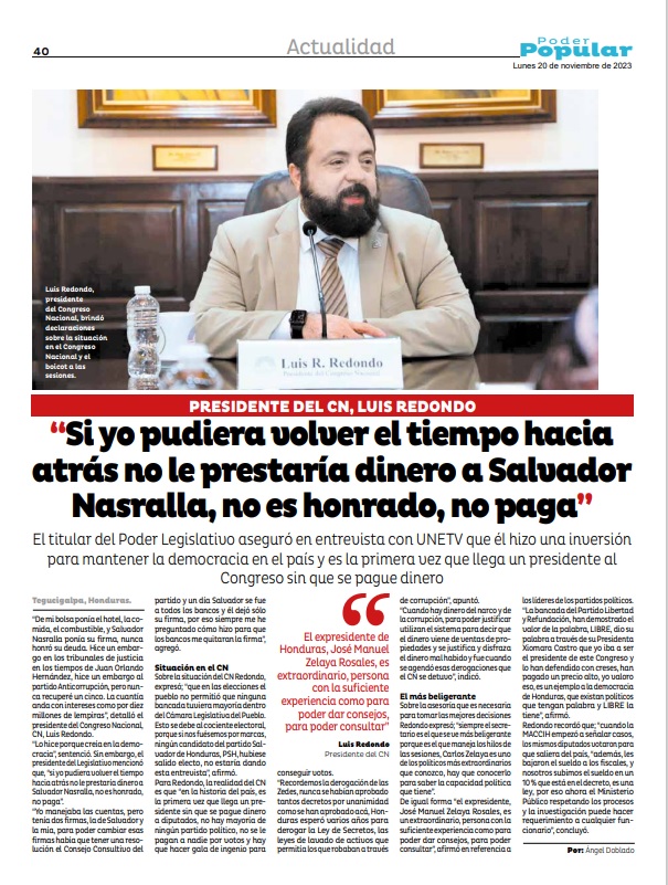 Redondo hizo la queja durante una entrevista brindada a un programa matutino del canal UNE TV, [medio afín al gobierno de Libre] y que fue retomada por Poder Popular. En el diálogo, el titular del Congreso Nacional, alegó que Nasralla nunca le hizo el reembolso del dinero que él invirtió durante la campaña política del Partido Anticorrupción (PAC) en 2017.