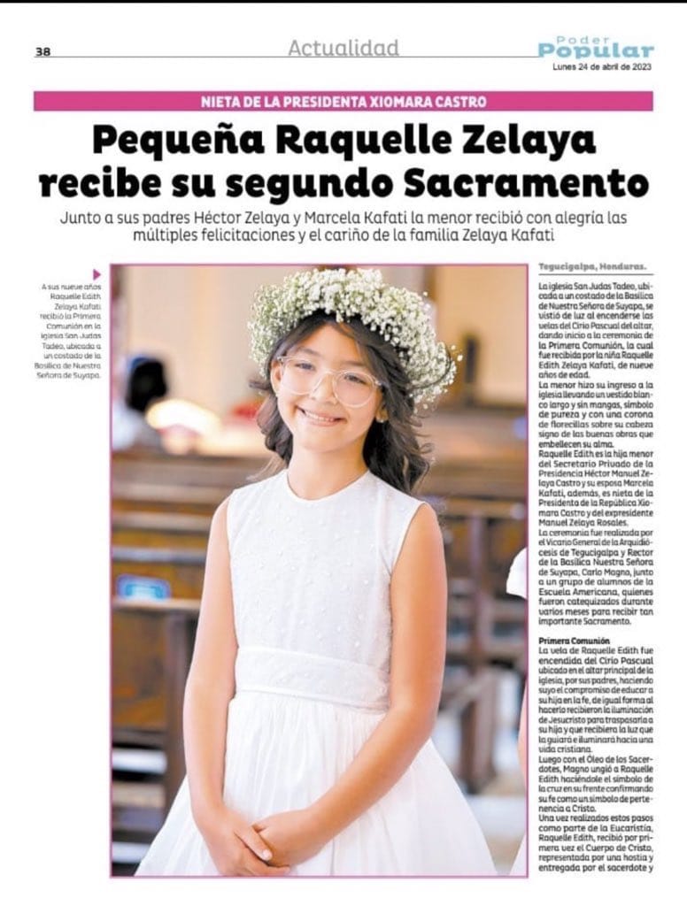 Otros de los ejemplos claros es la publicación efectuada el lunes 24 de abril del año en curso, cuando el periódico del gobierno publicó, en una página completa, que la nieta de la presidenta, Raquelle Edith Zelaya Kafati recibió el sacramento de la primera comunión. Este evento privado terminó siendo una noticia para un medio estatal.