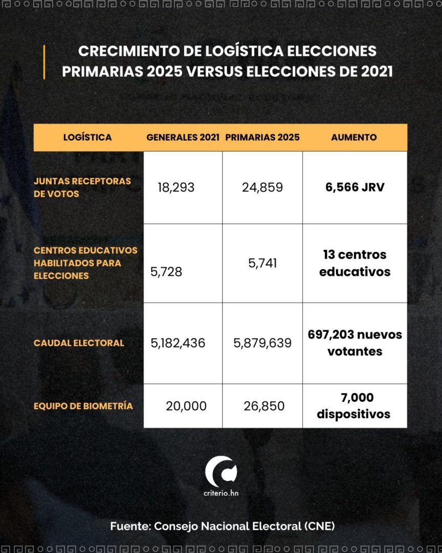 El presupuesto asignado para el proceso electoral actual supera al de años anteriores. En 2021, las elecciones primarias contaron con L1,000 millones de lempiras, a los que se sumó una ampliación de L760 millones para las generales, alcanzando un total de L1,760 millones. Esta cifra también supera la de 2017, cuando el presupuesto combinado para primarias y generales fue de L1,300 millones.