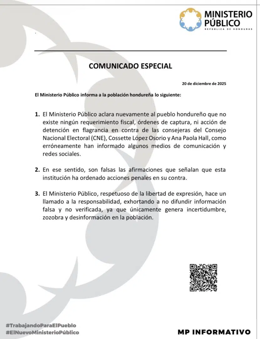 Tras dicha comunicación, el Ministerio Público, a través de un comunicado, aclaró al pueblo hondureño que no existe ningún requerimiento fiscal, órdenes de captura ni detención en flagrancia en contra de las consejeras del CNE.